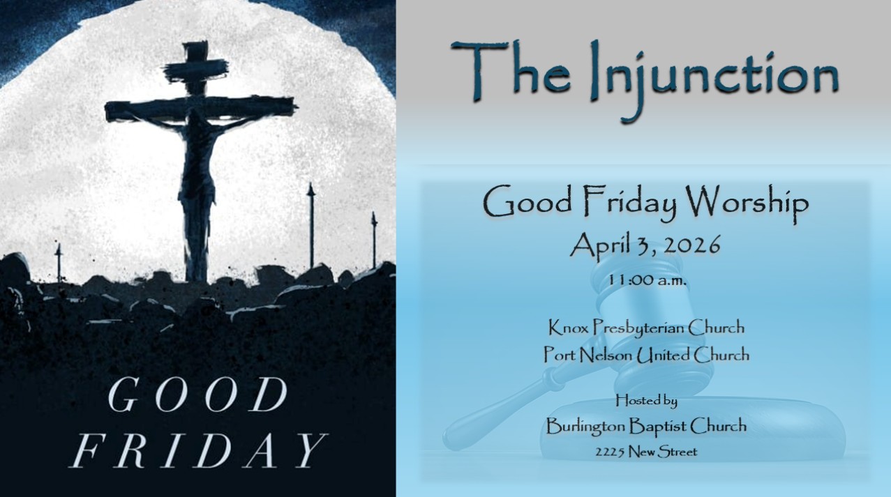 "The Injunction" - Join us as we gather to recall the crucifixion of Jesus with neighbouring congregations - Knox Presbyterian Church and Port Nelson United Church. Click here to download this week's bulletin.